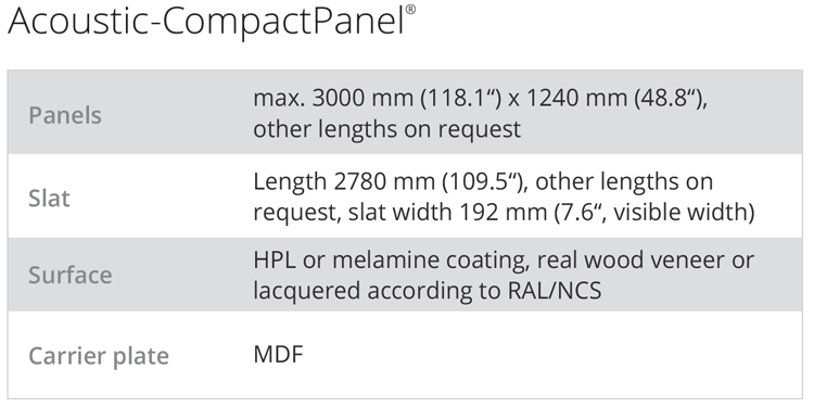 The Acoustic-CompactPanel® is a member of the successful Acoustic-Compact family. It stands for exceptional design, combined with a lot of possibilities in the demanding and fast paced interior décor designs. The Acoustic-CompactPanel® is on one hand available as a ready-made panel of a fixed format including edge processing and on the other hand as slat with a covering width of 192 mm and a longitudinally milled tongue and groove profile. Through this profile, the slat joinappears like one of the visible slots. This way an esthetically pleasing surface area is generated. A particular highlight of our Acoustic-CompactPanel® is the excellent absorption with alpha-w values of up to 0.75. |