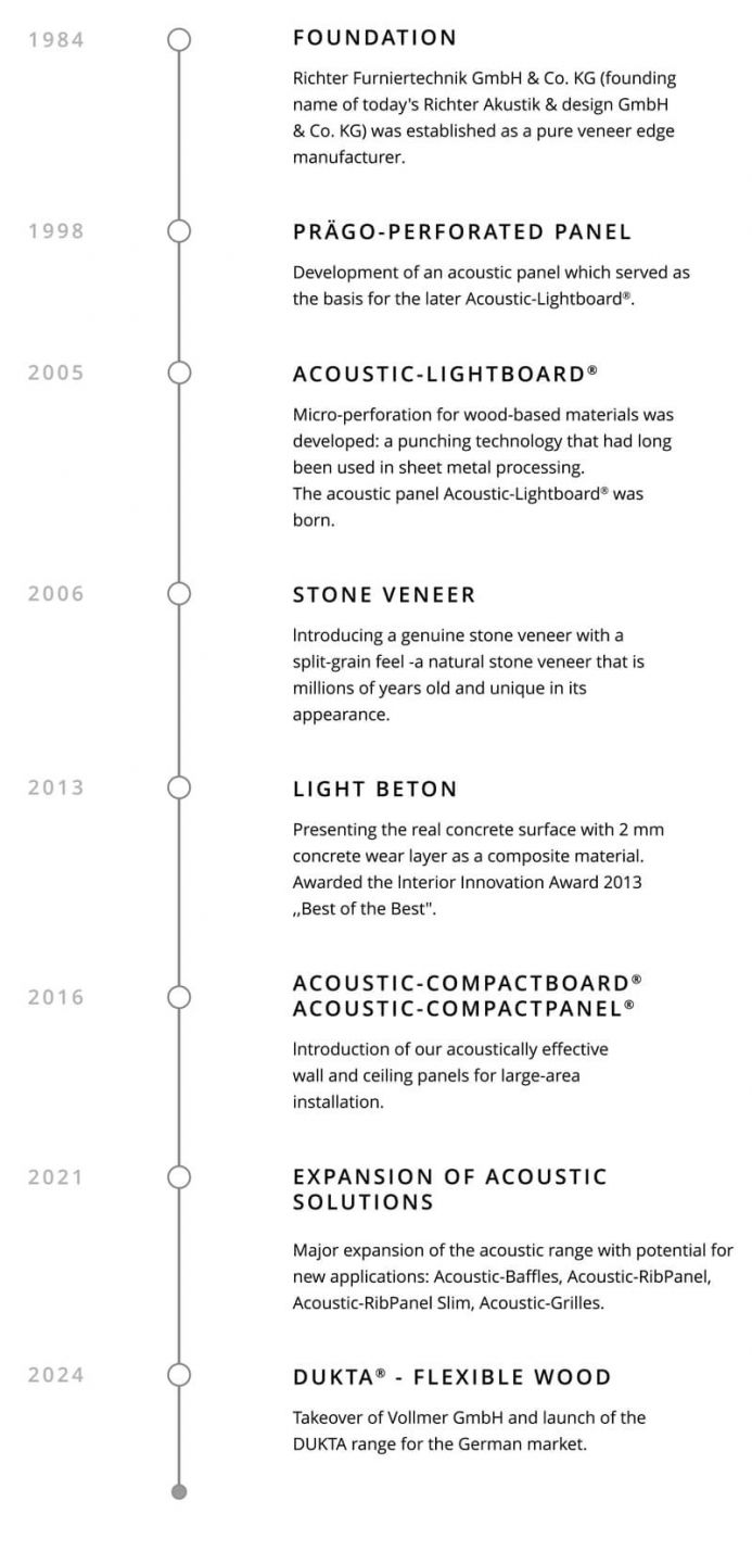 Since its foundation in 1984, Richter akustk & design GmbH & Co. KG has become a specialist for innovative surfaces in the fields of acoustics, design and fire protection. Our wide range of acoustic systems and surfaces for architects and designers convinces with a great variety of design possibilities and easy handling at the same time.