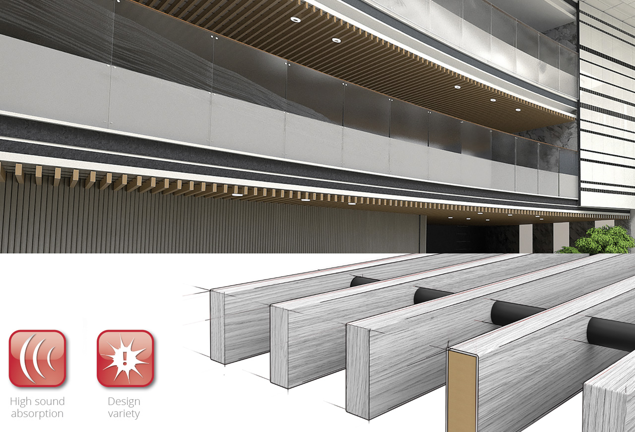 Acoustic-Grilles consist of vertical lamellas which can be manufactured individually with different surfaces and dimensions. The connection of the lamellas among each other is done either by means of aluminum tubes or wood material strips (backer). The course of the installed grilles appears seamless.