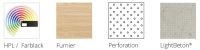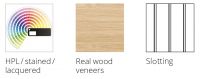 A wide range of HPL laminates, melamine surfaces and color lacquering according to RAL or NCS color codes are available for design.