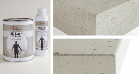 All LightBeton® standard panels are pre-coated at the factory with our water-based two-component acrylic sealant “WBAS 1993”. Vertical applications for walls and the furniture sector are thus protected against soiling. Horizontal applications for shelves, tables and other uses subject to heavier wear and stress should finally be coated completely (including the edges) after processing/machining. The WBAS 1993 sealant can be applied by cup gun or by hand roller. For further processing information regarding the use of WBAS 1993 consider the corresponding technical datasheet.