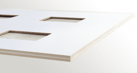 At the factory all standard panels are bonded on both sides with 1.5 mm thick LightBeton® on a 16 mm thick B1-MDF using PUR hot-melt. All panels come fire-rated and are covered by the fire protection consolidated certification B-s2, d0. The processor is responsible for checking whether the LightBeton® products are suitable for the intended application.
